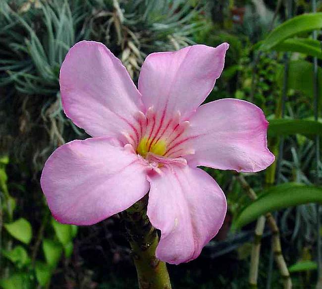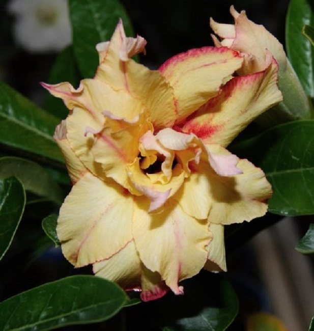 Адениум мультифлорум (Adenium multiflorum) Славится пышным цветением. Окраска цветов привлекательная, достаточно яркая. По краю лепестков проходит широкая красная кайма. Выращивание не вызывает трудностей.