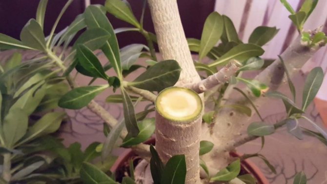Примерно через год рекомендуется обрезать верхушку адениума, чтобы растение ветвилось. В период активного роста цветка необходимо обрезать тонкие и слабо жизненные стебли. Через 1-1,5 месяца на месте срезов появятся новые отростки.