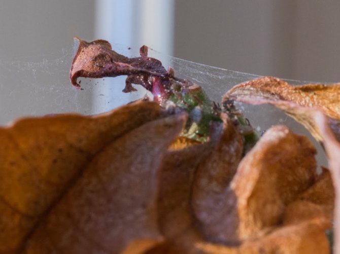 Паутинный клещ В результате поражения паутинным клещом, листва становится бледной, опадает. Рост останавливается. Среди ветвей можно увидеть тонкую паутину. Паутинный клещ появляется в помещении с сухим воздухом.