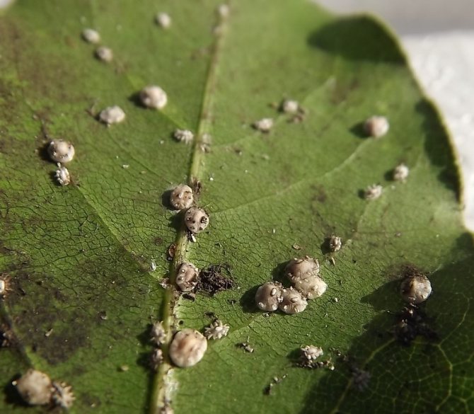 Щитовки и ложнощитовки Насекомые попадают в горшок через зараженную почву. Для удаления щитовок стебель обрабатывают пеной из хозяйственного мыла, а затем проводят опрыскивание химпрепаратами. Чтобы избавиться от паразитов, необходимо полностью извлечь растение из земли, стряхнуть лишнюю почву и пересадить в новый субстрат.