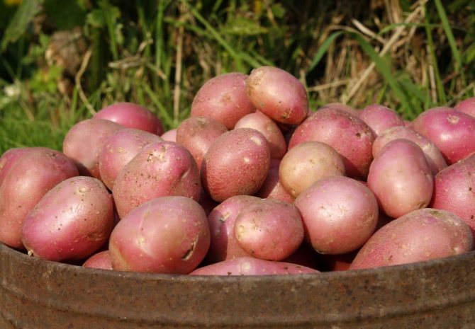 Форма у небольших по размеру клубней округлая. Кожура – красно-розовая, очень гладкая, с неярко выраженными глазками. С одного куста собирают от 8 до 12 шт. овощей. У сочной мякоти на срезе белый оттенок.