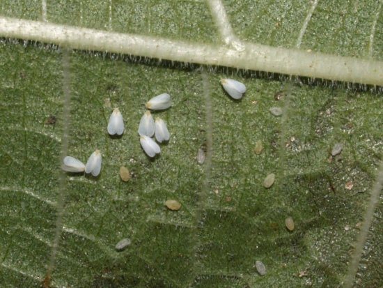 Мелкие белесые насекомые, напоминающие моль, вспархивают с растения при любом, даже самом лёгком прикосновении к нему. Листья желтеют, затем становятся почти прозрачными.
