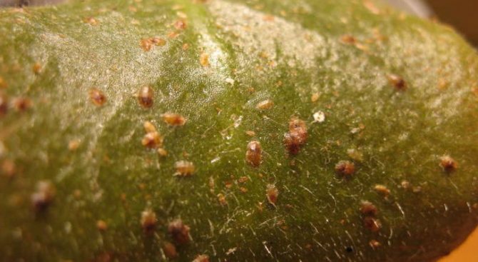 - Щитовки, тля, клещи, белокрылки тоже наносят большой вред. Поэтому необходимо дезинфицировать землю, вовремя удалять поврежденные листья, правильно ухаживать за цветком.