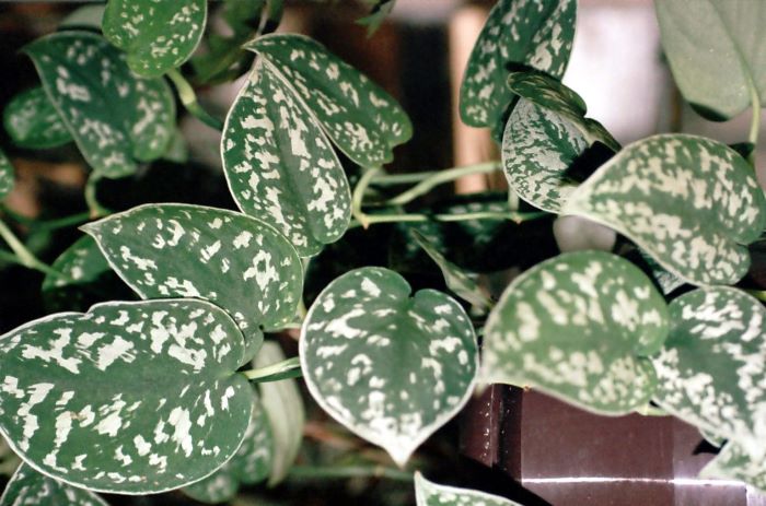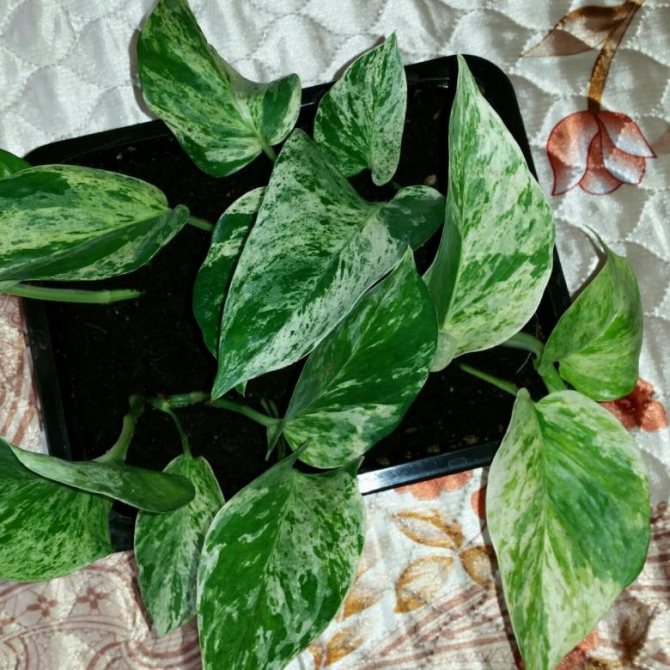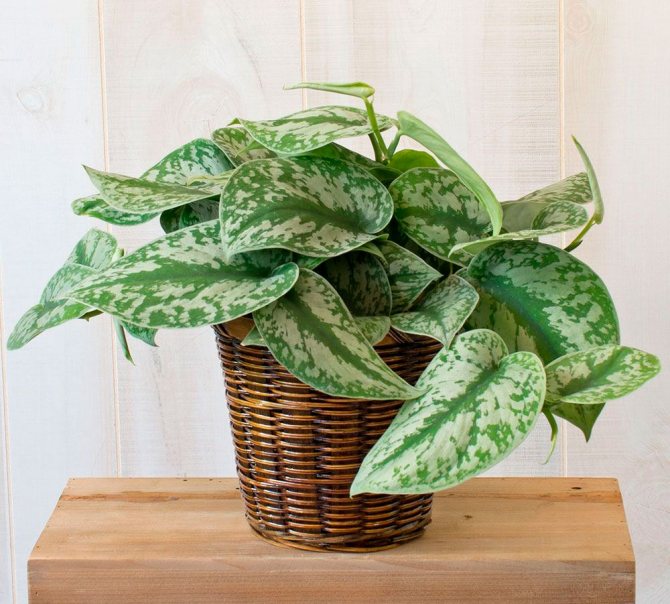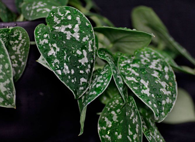- Вариегатная форма Scindapsus pictus var. argyraeus. Листва у такой формы короче и шире чем у основного вида. На ее поверхности имеются маленькие пятнышки правильной формы.