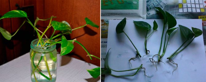 Чаще всего цветоводы размножают сциндапсус черенкованием. Срезанные во время формировки куста верхушечные черенки на укоренение можно поместить в емкость с водой либо высадить в субстрат, корни они дадут довольно быстро. Главные условия успешного укоренения: