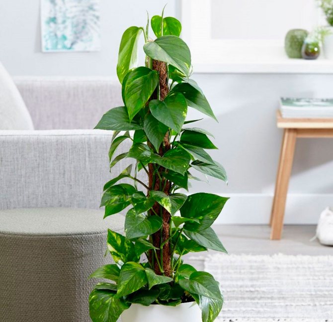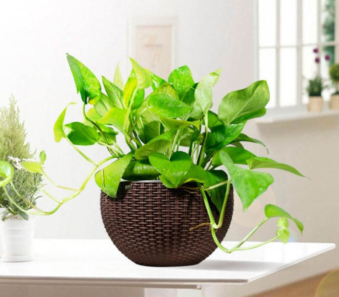 В комнатных условиях сциндапсус является лазающим растением, обладающим декоративной пестрой либо насыщенно-зеленой листвой, которая схожа с листьями части видов филодендрона. Листовые пластины у него очереднорасположенные простые глянцевые и кожистые, форма у них овальная. Во время цветения формируется маленькое соцветие внешне схожее с початком кукурузы, который обернут прилистником, как покрывалом. Однако выращиваемая в домашних условиях лиана цветет крайне редко, но зато она нетребовательна в уходе.