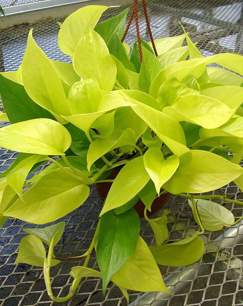 Данный вид пользуется у цветоводов наибольшей популярностью. Его растят в качестве ампельного либо лазящего растения. Если вы решили пустить его по стене, то в этом случае стебли цветка в длину могут вырасти до 200 сантиметров и более. Листва у данного вида внешне схожа с филодендроном, однако она обладает более эффектным окрасом. На поверхности кожистой блестящей листвы, окрашенной в зеленый цвет, имеются брызги и мазки желтого окраса. Довольно декоративными считаются следующие культурные формы сциндапсуса золотистого: