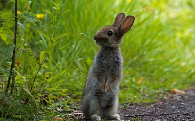 Кролик породы белка ест траву