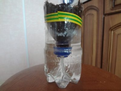 - Для заполнения емкости водой от оставшейся верхней части бутылки отрезается горлышко;
