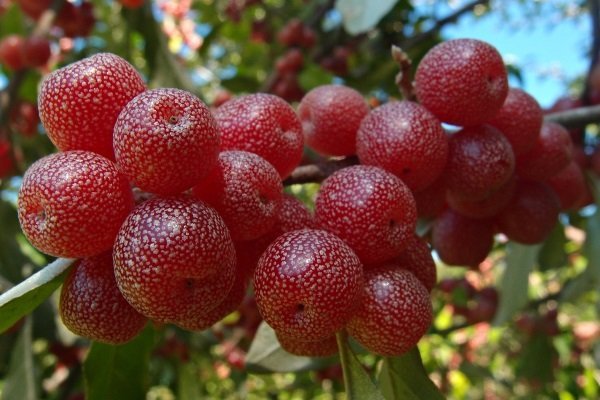 - Шефердия серебристая. Именно её выращивают ради ягод. Она представляет собой листопадный кустарник — увядшие листья могут оставаться висеть на ветках, высотой 4,5 мс колючими побегами. Листья небольшие — 4-5 см в длину зелёного цвета и эллипсообразной формы. С двух сторон они покрыты пушком, на солнце приобретают серебристый отлив. Плоды созревают в августе, облепливая ветки, как и облепиха. Собирают их после первых заморозков, которые благоприятно сказываются на их вкусовых качествах — они становятся менее терпкими, более нежными и сладкими.