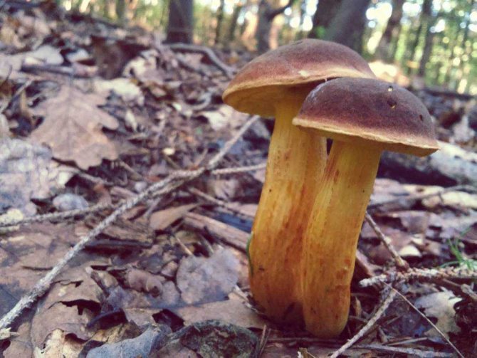 Ножка у этого гриба длинная, цилиндрическая. Она вырастает до 90 см высотой. Толщина ножки около 3,5 см, лимонного оттенка. Что касается мякоти, то у желто-бурого моховика она плотная и достаточно твердая. Сбор грибов осуществляется в период с июля по октябрь.