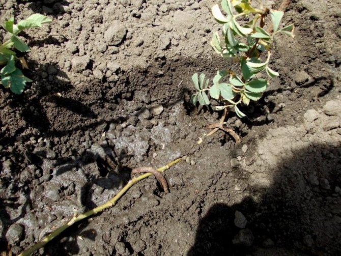 - В лунках расположить отводки, сверху полить водой и присыпать землей.