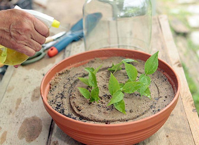 Важно! Оптимальная температура для образования корневой системы 20-22 °C выше нуля. Когда ожидается похолодание, емкость с высаженными черенками лучше оставить в доме.
