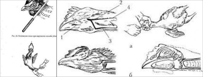 Как убить курицу наружным и внутренним способом показано на рисунке 1. Потом птицу оставляют висеть вниз головой, для лучшего обескровливания.