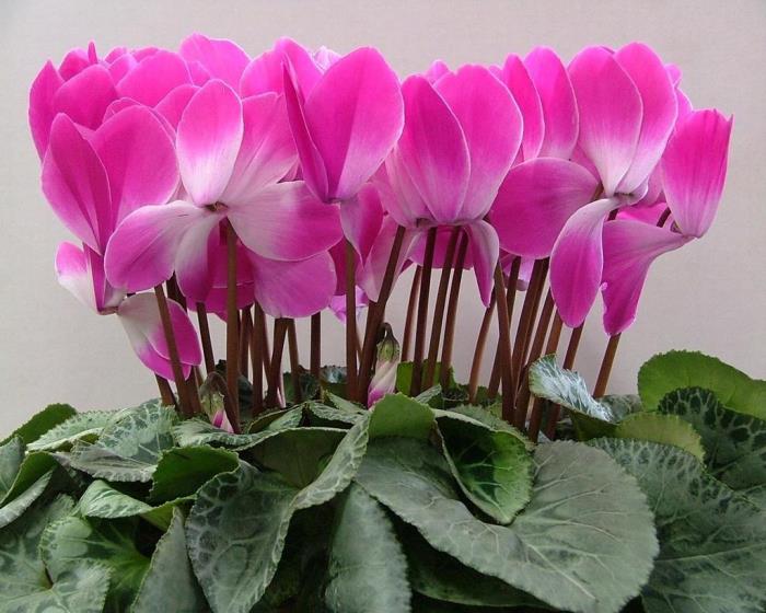 Идеальные условия выращивания цикламена – низкая температура и хорошее освещение, при этом стоит избегать прямых солнечных лучей. Цветки обладают изысканной заостренной формой, а также огромной цветовой палитрой: от белоснежных до бордовых оттенков. Особенностью этого растения является продолжительность цветения: с осени и до весны. Для того чтобы цветок хорошо себя чувствовал, следует при уходе учитывать его потребности.