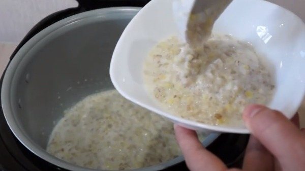 - После того, как геркулес хорошо разбух, влить в емкость холодное молоко, тщательно размешать.