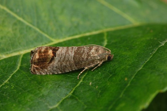 Плодожорка яблока — это бабочка небольшого размера, имеющая серо-коричневую окраску. У насекомого размер крылышек достигает 2 см. Бабочка не представляет особой опасности, плоды не ест, как это может показаться из названия, а разводит гусениц. Но маленькие паразиты появятся в тот момент, когда на дереве уже висят наливные яблочки. Борются с вредителями подручными средствами.