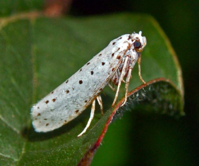 Яблонная моль напоминает обычную бабочку только небольших размеров. Ее гусеницы выедают листья, а затем плетут паутину. Для борьбы с ней делают настои из картофеля или томата либо используют средство из молотого перца (1 ч. ложка на 1 ведро воды). Настой должен постоять 2 дня перед использованием.