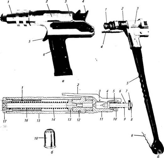 Пневматические пистолеты(рис. 2.2) лишены этих недостатков. Воздух давлением 1 МПа от автономного компрессора поступает по шлангу 3 в пневмоцилиндр, установленный в корпусе 2.
