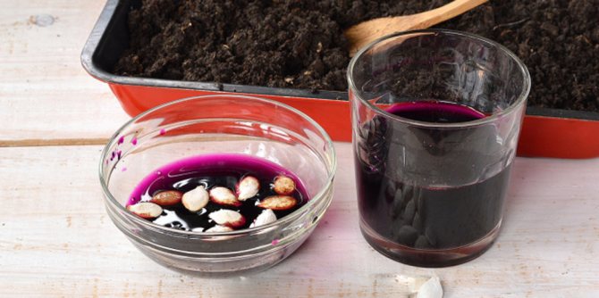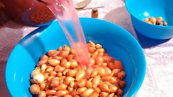 Для замачивания семенного лука требуется слабый раствор марганцовки: 1 г порошка на 1 л воды. Лук помещают в получившуюся жидкость на 30 минут, затем высаживают в грунт.