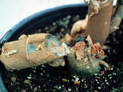 Фузариос – инфекционное заболевание цветка, при котором поражаются корни и прикорневая часть диффенбахии. На пораженных участках появляются длинные оранжевые пятна, которые приводят к засыханию и гибели растения. В появлению такой инфекции приводит пересушенная почва и недостаток удобрений. Чтобы вылечить деревце, нужно вынуть корни из горшка, промыть под водой и избавиться от зараженной почвы. Затем несколько раз произвести опрыскивание корней препаратами, содержащими фунгициды, и пересадить растение в новую почву.