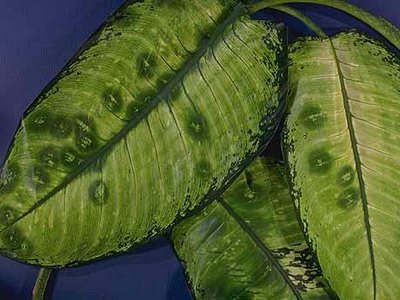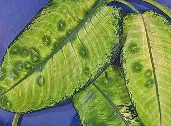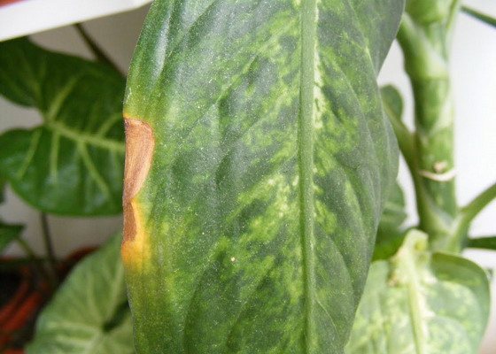 В одной мудрой книге записана простая истина, что все живое страдает от болезней. Правдивость этих слов мы наблюдаем изо дня в день. К сожалению, растения тоже болеют и тропическая красавица не исключение. Исследования показывают, что она подвержена грибковым, вирусным и бактериальным заболеваниям. Одно из них проявляется, когда на листьях диффебахии образуются коричневые пятна, вокруг которых имеется оранжевая каемка. Со временем они распространяются на весь лист, в результате чего он погибает.