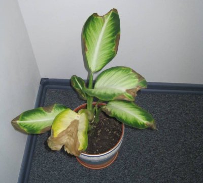 К нарушению правил по уходу за растением могут привести несколько факторов. На первом месте стоит неправильный полив – он может быть или чрезмерно обильным, или недостаточным. Воздух в помещении, где находится диффенбахия, может быть очень сухим. Также это касается и офисных помещений, где освещение в большинстве случаев искусственное, а сам вазон стоит на подоконнике, куда практически не проникает солнечный свет. Как бы это странно не звучало, но к нарушению по уходу за растением, могут быть причастны и домашние животные. Они могут грызть или царапать листья цветка, но повреждения могут быть незаметны на первый взгляд. Таким образом может заноситься инфекция, мешающая нормальному развитию растения.