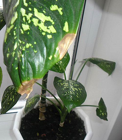 Если вы все это время считали, что диффенбахии нужно больше света — забудьте. Передозировка солнцем, в частности от прямых лучей, также вредна, как и дефицит. Плюс ко всему, помимо желтизны листьев, цветок перегретый солнцем получает ожоги. На краях листьев будет появляться сухость, они начнут скручиваться, а в центре листа могут появляться коричневые пятна. Растение постепенно погибает.