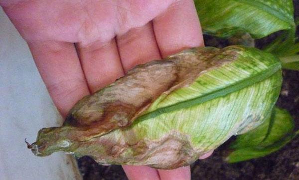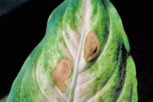 - грибковые поражения (атракноз, пятнистость листьев), споры грибка (пятнистость листьев) растение может получить с поливочной водой, по краям листьев появляются сухие коричневые пятна, постепенно распространяющиеся по всей поверхности листа, он становится вялым, безжизненным.