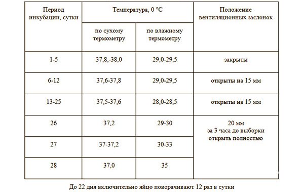 В самом инкубаторе оптимальная температура для индюшиных яиц лежит в диапазоне +36,5…+38,1 °С, но для успешного выведения птенцов её необходимо немного менять на протяжении всего периода инкубации, который длится 28 дней. Это выглядит так: