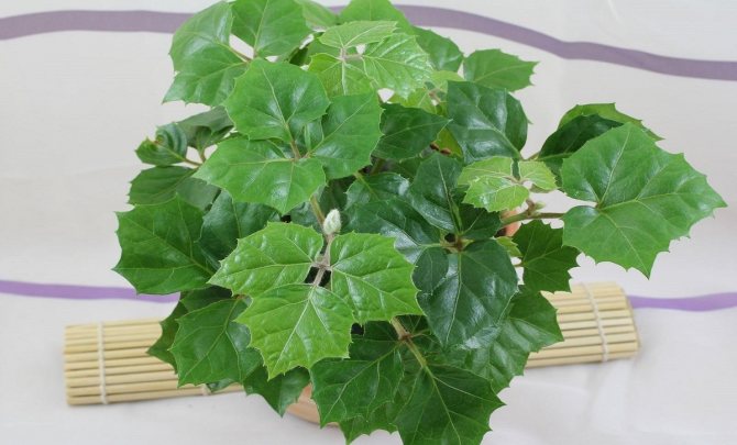 Обратите внимание на фото этого растения с разноцветными листьями — полисциас Бальфура (Polyscias balfouriana) имеет серо-пятнистые листья шириной 8 см; у листьев его разновидности Pennockii желтые жилки. Листья П. кустарникового (P fruticosa) длиной 20 см.