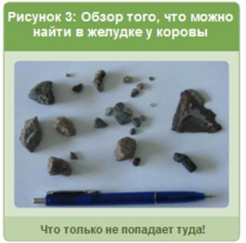 Поскольку жвачные в целом при еде перебирают мало и вряд ли выплевывают что либо, часто в розетку кардии желудка попадают инородные тела (куски проволоки, гвозди, остроконечные запчасти от машин, камни) (рисунок 3).