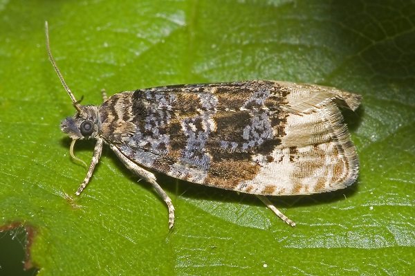 - у яблонной плодожорки расцветка темно-серая, декорированная поперечными волнистыми линиями;